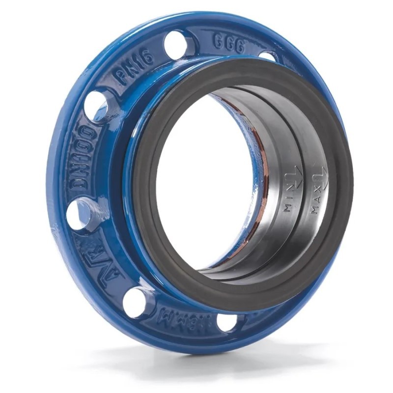 - La junta está soportada por un anillo de fundición dúctil revestido de epoxi