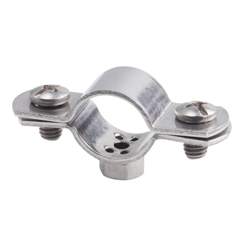 - Abrazadera M6 de acero inoxidable, indicada para la fijación de mangueras, tuberías o tubos en instalaciones industriales, de climatización o en entornos en los que se requiera un material de alta resistencia.