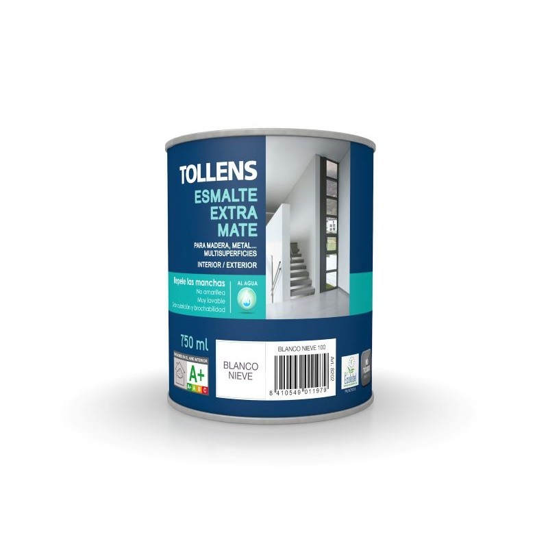 - Esmalte multisuperficies al agua extra mate con resinas acrílicas que no amarillean en el interior y aditivos especiales que repelen las manchas.